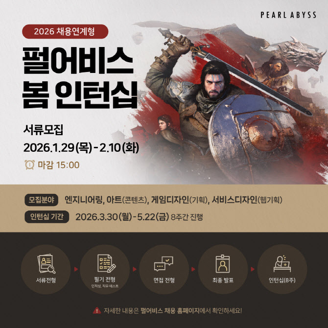 지원 대상은 기졸업자 및 졸업 예정자다. 지원서는 29일부터 2월 10일까지 펄어비스 채용 홈페이지를 통해 접수 가능하다. 직무별 상세 요건과 전형 일정은 채용 공고에서 확인할 수 있다.