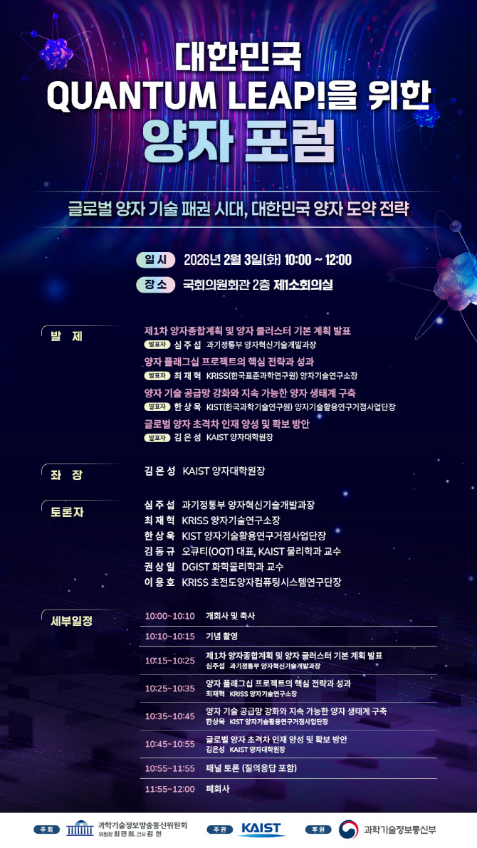 행사에서는 정부의 제1차 양자종합계획과 양자클러스터 기본계획, 주요 연구기관의 양자 플래그십 프로젝트 성과, 양자 기술 공급망 강화 전략, 초격차 인재 양성 방안을 집중적으로 다룰 예정이다.