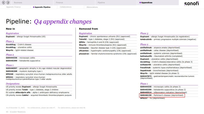 사노피는 SAR446159(ABL301)의 개발 우선순위를 조정했다. (자료=사노피의 4분기 실적보고서)