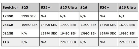 30일 업계에 따르면 독일 IT매체 윈퓨처(Winfuture)의 롤랑 콴트(Roland Quandt)는 스웨덴에서 출시하는 갤럭시S26 시리즈의 출고가 정보를 공개했다. 갤럭시S26 시리즈의 출고가 정보가 윤곽을 드러낸 건 이번이 처음이다.