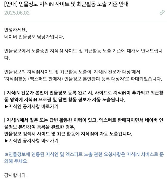 네이버는 지난해 6월 공지 사항을 통해 '인물정보에서 노출하는 지식인 사이트의 노출 기준을 지식인 전문가에서 엑스퍼트 판매자·인물정보 본인 참여자로 확대한다'는 공지 사항을 올렸다.