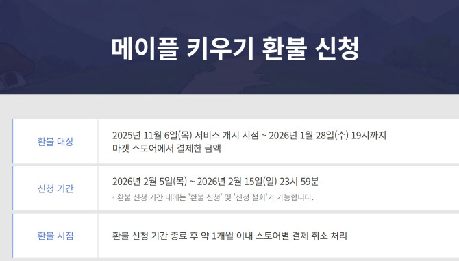 5일 정오 환불 신청을 시작한 넥슨 ‘메이플 키우기’ (사진=메이플 키우기 홈페이지 갈무리)