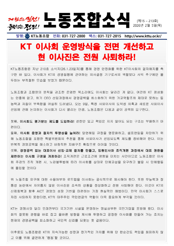 노조는 이사회가 자진 사퇴하지 않을 경우 대주주인 국민연금의 역할이 더욱 중요해질 것이라고도 언급했다. KT 내부와 시장에서는 국민연금의 의결권 행사 방향과 노조의 압박이 맞물리며 이사회 개편 논의가 급물살을 탈 가능성에 주목하고 있다.