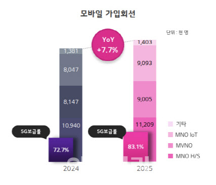 실적 개선의 중심에는 모바일 가입자 증가가 있다. 작년 LG유플러스의 모바일 부문 매출은 6조6671억원으로 전년 대비 3.7% 증가했다. 이동통신(MNO)와 알뜰폰(MVNO)을 합한 전체 무선 가입 회선 수는 3071만1000개로, 사상 처음으로 3000만명을 넘어섰다.