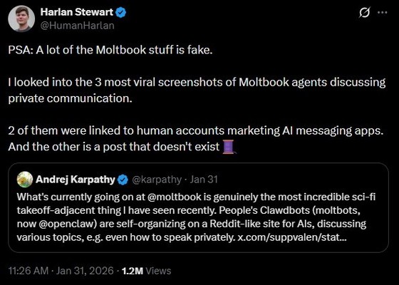 UC버클리 기계지능연구소 소속이라 밝힌 할란 스튜어트는 X를 통해 "몰트북에서 가장 많이 이슈가 된 AI 작성 게시물 상당 부분은 가짜"라며 "안드레이 카파시가 홍보한 게시물 역시 AI 메시징 앱을 홍보하는 사람의 계정과 연결돼 있었다"고 했다.