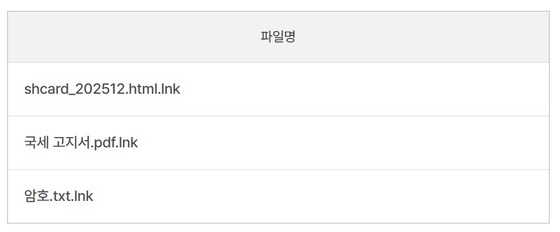 이러한 악성 코드들은 '국세 고지서.pdf.lnk', 'shcard_202512.html.lnk', '유튜브 캠페인 유료 파트너십 제안.docx.lnk' 등의 파일에 탑재됐다.