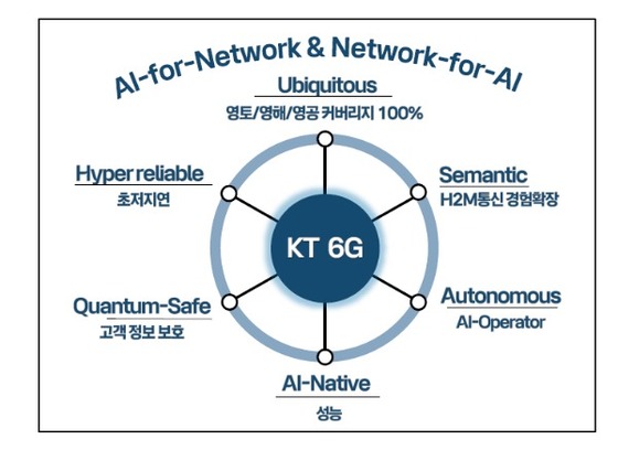 KT는 △초연결(Ubiquitous) △초저지연(Hyper Reliable) △퀀텀 세이프(Quantum-Safe) △AI 네이티브(AI-Native) △자율 네트워크(Autonomous) △의미 중심 전송(Semantic Communication)을 6G 주요 기술로 제시했다.