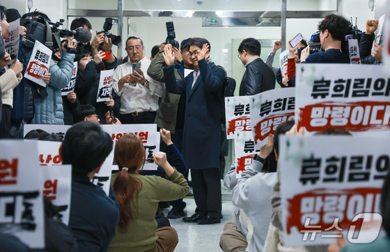 전국언론노동조합 조합원들이 12일 오후 서울 양천구 방송미디어통신심의위원회에서 2026년 제1차 방미심위 정기 회의를 앞두고 윤석열 정부 방심위원이었던 김우석 상임위원 임명 철회를 촉구하며 구호를 외치는 가운데 김 위원이 손을 흔들고 있다. 2026.3.12 © 뉴스1 안은나 기자