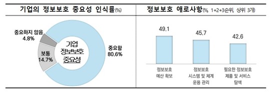 기업 10곳 중 8곳은 정보보호가 '중요하다'고 인식하고 있었지만 절반에 가까운 기업들은 정보보호 업무 관련 주요 애로사항으로 '정보보호 예산 확보'를 꼽았다.