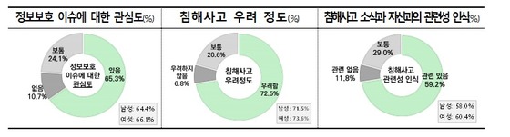 정보보호 관련 이슈에 대해 65.3%가 '관심 있다'고 응답했으며 침해사고에 대해 '우려한다'(우려하는 편이다 + 매우 우려한다)는 응답이 72.5%로 조사됐다.