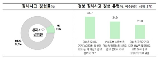 침해사고 '경험이 있다'는 응답이 8.5%로 조사됐다. 경험한 침해사고 유형으로는 '개인용 모바일 기기 해킹'(44.7%)이 가장 많았다.