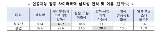 실제 청소년의 89.4%, 성인의 87.6%가 인공지능을 활용한 사이버폭력이 심각하다고 인식하고 있었다. 그 이유로 청소년은 '제작 용이성에 따른 피해 보편성'(48.7%), 성인은 '반복·지속 피해 가능성'(28.3%)을 꼽았다.