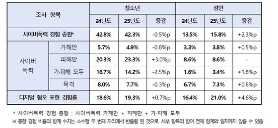 유형별로는 청소년과 성인 모두 '사이버 언어폭력'의 가·피해 경험이 가장 많았다.