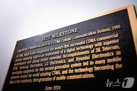 SK텔레콤은 한국전자통신연구원(ETRI), 삼성전자, LG전자와 합작한 CDMA 대규모 상용화가 국제전기전자공학협회(IEEE)가 선정하는 'IEEE 마일스톤'에 등재됐다. 사진은 SK텔레콤 본사 사옥 외벽에 설치된 ‘IEEE 마일스톤’ 현판.(SKT 제공) 2024.6.10 © 뉴스1