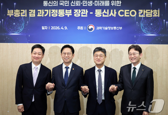 배경훈 부총리 겸 과학기술정보통신부 장관(왼쪽 두 번째)이 9일 오후 서울 강남구 한국과학기술회관에서 열린 통신사 CEO 간담회에 앞서 홍범식 LG 유플러스 대표(왼쪽부터), 정재헌 SK텔레콤 대표, 박윤영 KT 대표와 기념 촬영을 하고 있다. 2026.4.9 © 뉴스1 김진환 기자