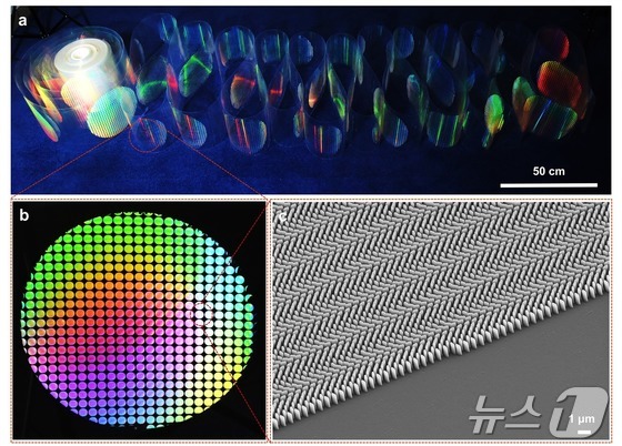 기존에는 딱딱한 니켈 금형을 사용해 메타렌즈를 하나씩 제작하는 방식이었다. 반면 연구팀은 유연한 고분자 복제 금형을 12인치 크기의 원통형 롤러 형태로 제작했다.