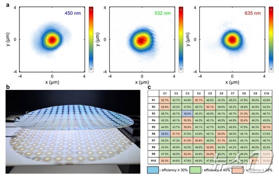 또 원자층 증착(ALD) 방식으로 이산화티타늄(TiO₂)을 코팅해 가시광 전 영역에서 90% 이상의 광 효율을 확보했다. 동시에 고성능 렌즈 기준인 슈트렐 비율(Strehl ratio) 0.8 이상을 달성했다.