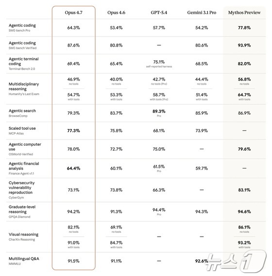 앤트로픽 '클로드 오퍼스 4.7' 주요 성능 벤치마크 비교. (앤트로픽 제공)