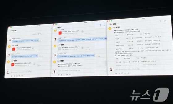 NHN두레이가 28일 경기 성남시의 사옥 플레이뮤지엄에서 기자 간담회를 열고 업무 협업 플랫폼 '두레이'(Dooray!)에 새롭게 탑재된 인공지능(AI) 에이전트 서비스를 소개했다. 사진은 '두레이 AI 에이전트' 중 금융감독원 전자공시시스템(DART)에 특화된 '빌트인 에이전트'를 시연하는 모습. 2026.04.28. © 뉴스1 신은빈 기자