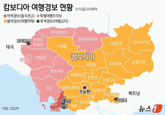외교부가 캄보디아에서 한국인을 대상으로 한 취업사기·감금 피해가 급증함에 따라 일부 지역에 대해 여행경보 최고 단계인 4단계(여행금지)를 발령했다. 16일 0시부터 현재 2.5 단계에 해당하는 특별여행주의보(여행자제와 출국권고 사이)가 발령된 지역 중 캄폿주 보코산 지역, 바벳시, 포이펫시는 여행금지 지역으로 지정됐다. 시하누크빌주는 3단계(출국권고)로 조정됐다. © News1 김지영 디자이너