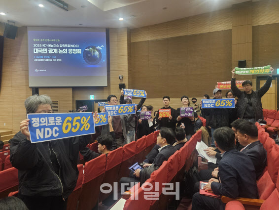 공청회장에서는 NDC를 둘러싼 입장 차이가 선명하게 드러났다. 이날 여성환경연대를 비롯한 환경단체 관계자들은 전문가 토론이 시작되기 전 ‘2035 NDC 65%’라고 적힌 손피켓을 들고 정부안 상향을 촉구했다.