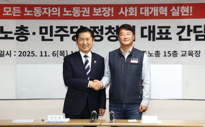 정청래 더불어민주당 대표가 6일 서울 중구 전국민주노동조합총연맹(민주노총)에서 열린 간담회에서 양경수 위원장과 기념촬영을 하고 있다.(사진=뉴스1)