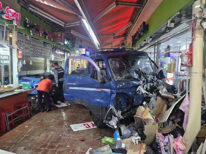 사고를 낸 차량은 전통시장 내 100m 가량을 주행하다가 인근 점포를 들이받고 멈춰 선 것으로 나타났다.