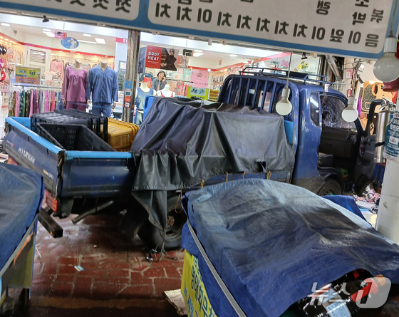 13일 경기 부천 오정구 원종동 제일시장에서 A 씨가 몰던 1톤 트럭이 돌진하는 사고가 발생해 경찰 관계자들이 사고차량을 수습하고 있다. 2025.11.13/뉴스1 © News1 이호윤 기자