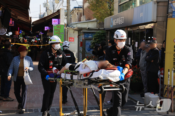 13일 오전 10시 55분쯤 경기 부천 오정구 원종동 제일시장에서 A 씨가 몰던 1톤 트럭이 돌진하는 사고가 발생해 소방대원들이 부상자를 이송하고 있다. 2025.11.13/뉴스1 © News1 이호윤 기자