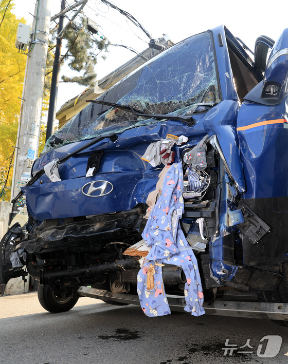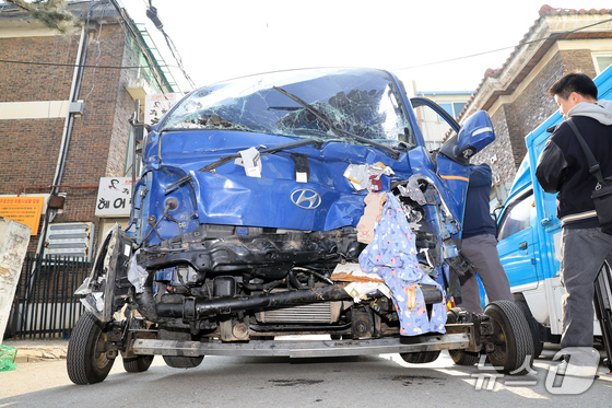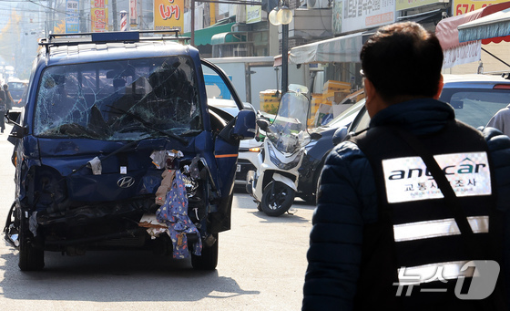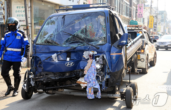 13일 경기 부천 오정구 원종동 제일시장에서 A 씨가 몰던 1톤 트럭이 돌진하는 사고가 발생해 교통사고조사 관계자들이 사고차량을 수습하고 있다. 2025.11.13/뉴스1 © News1 이호윤 기자