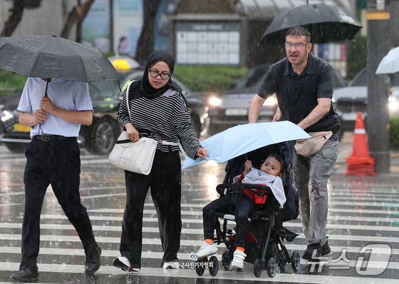요란한 가을비가 내린 9월 16일 오후 서울 중구 서울시청 앞을 지나는 외국인 부모가 유모차를 탄 아이에게 우산을 씌워준 채 급히 발걸음을 옮기고 있다.