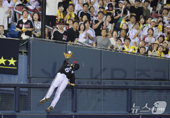 7월 25일 서울 송파구 잠실야구장에서 열린 프로야구 '2025 신한 SOL뱅크 KBO 리그' LG 트윈스와 두산 베어스의 경기, 5:6으로 뒤진 두산의 9회말 공격 2사 1,3루 상황에서 LG 3루수 구본혁이 두산 이유찬의 뜬공 타구를 담장을 타고 낚아채고 있다.