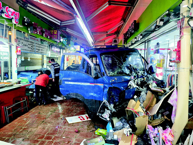 13일 오전 10시 55분쯤 경기 부천시 오정구 원종동 제일시장에서 1t 트럭이 시장통로로 돌진한 모습. (사진=경기 부천소방서)