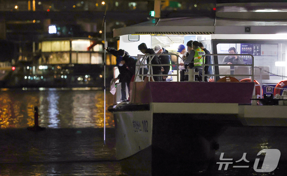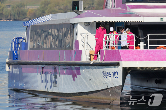 지난 15일 서울 송파구 잠실선착장 인근에 한강버스가 강바닥에 걸려 멈춰 서 있는 가운데 한강경찰대, 한강버스 관계자들이 현장을 살펴보고 있다. 2025.11.15/뉴스1 © News1 김진환 기자