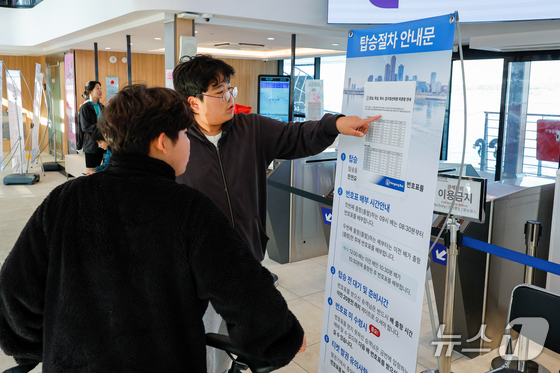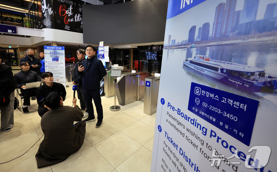 16일 서울 송파구 한강버스 잠실선착장을 찾은 학생들이 잠실, 뚝섬, 옥수, 압구정선착장 미운항 안내문을 보고 있다. 2025.11.16/뉴스1 © News1 안은나 기자