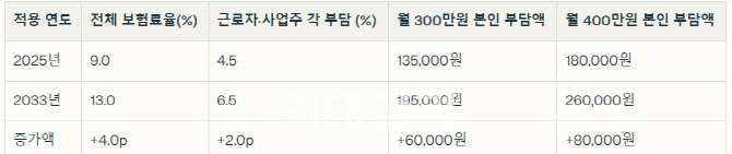 국민연금 개편 논의도 부담을 키운다. 정부는 연금 재정 안정화를 위해 보험료율을 2026년부터 매년 0.5%포인트씩 올려 2033년 13%까지 인상하는 방안을 제시했다. 확정안은 아니지만, 고령화 속도를 고려할 때 보험료 조정은 불가피하다는 게 정부와 전문가들의 공통된 판단이다.