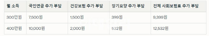 월소득 300만원 근로자의 경우에는 다음 해 사회보험료가 약 9400원 늘어나고, 400만원 근로자는 1만2500원가량 오른다