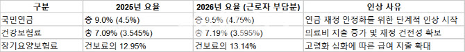 내년부터 국민연금 보험료율은 현행 9%에서 9.5%로, 건강보험료율은 7.09%에서 7.19%로 인상된다. 장기요양보험료율 역시 건강보험료의 12.95%에서 13.14%로 오른다. 국민연금과 건강보험은 사업주와 근로자가 절반씩 부담하지만, 장기요양보험은 전액 근로자 부담이다.