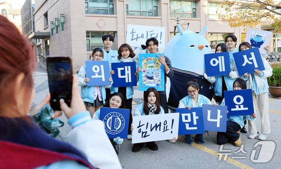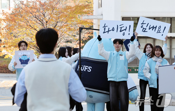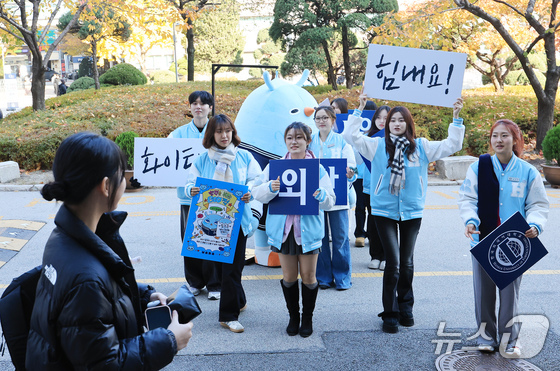 16일 서울 동대문구 한국외국어대학교에서 열린 2026학년도 수시모집 학생부종합전형 면접고사에서 한국외국어대학교 홍보대사 학생들이 수험생들을 응원하고 있다. 2025.11.16/뉴스1 © News1 이호윤 기자