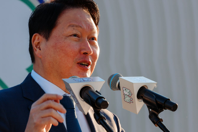 최태원 SK그룹 겸 대한상공회의소 회장이 28일 경상북도 경주시 사정동 플레이스C 갤러리에서 열린 ‘APEC CEO SUMMIT 2025, 배우자 미술전시 오프닝’에서 축사하고 있다. (공동취재사진단)