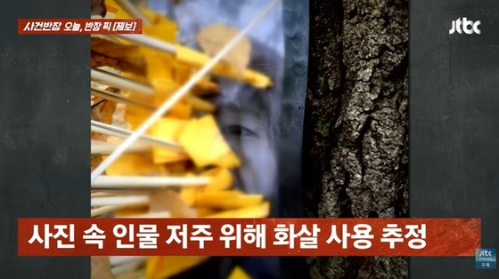 A 씨는 얼마 전 서울 송파구의 한 주거 단지 인근 산책로에서 인물 사진에 수십 개의 화살이 꽂혀 있는 나무를 발견했다.