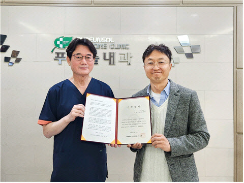 고려대안산병원 홍광대 진료협력센터장이 병원을 대표해 권오성 원장에게 기부 증서를 전달하고 있다. 왼쪽부터 푸른솔내과의원 권오성 원장, 고려대안산병원 홍광대 진료협력센터장.