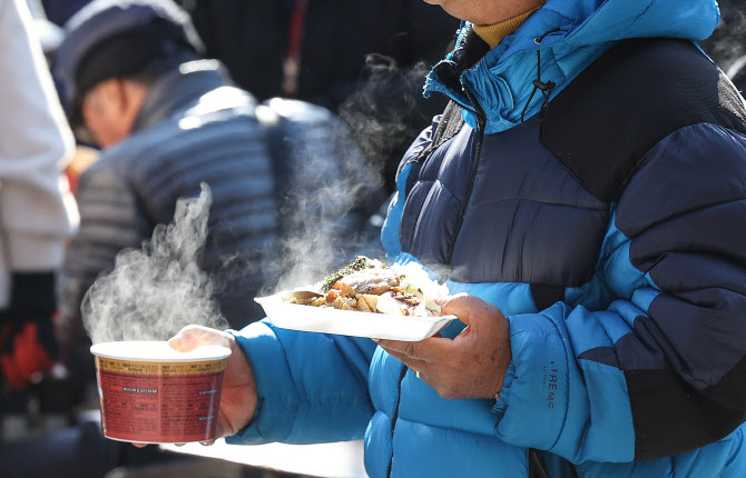 올가을 가장 추운 날씨를 보인 18일 대구 달서구 두류공원 사랑해밥차 무료 급식소에서 어르신들이 따뜻한 밥을 받아 이동하고 있다. (사진=연합뉴스)