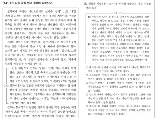 국어 영역 17번은 EBS와 학원가 등에서 고난도로 평가한 문항으로 독일 철학자 임마누엘 칸트의 인격 동일성에 대한 견해를 담은 지문을 읽고 풀어야 한다.