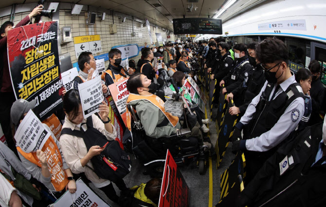 지난 4월 서울 지하철 4호선 혜화역 동대문 방면 승강장에서 열린 제62차 ‘출근길 지하철 탑니다’ 시위에서 전국장애인차별철폐연대(전장연) 회원들이 경찰·서울교통공사 직원 등과 대치하고 있다. (사진=뉴스1)