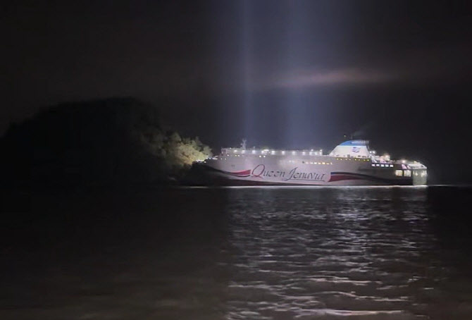 19일 오후 8시 17분께 전남 신안군 장산도 남방 죽도에 여객선 퀸제누비아2호가 좌초돼 해경이 구조 작업을 벌이고 있다.(사진=연합뉴스)