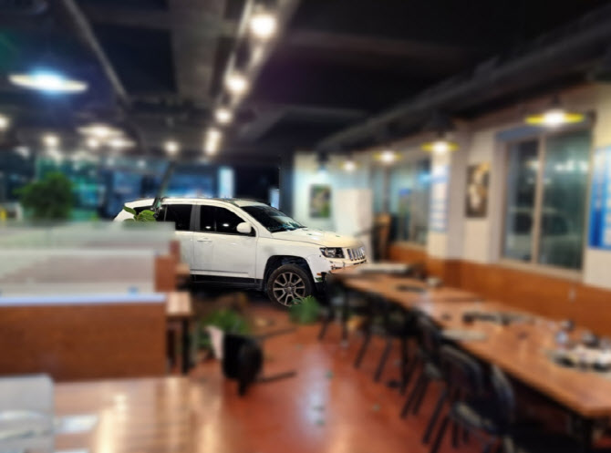 당시 식당에 이용객이 있었지만 다행히 사람이 없는 위치로 차량이 돌진해 인명피해는 없었다.