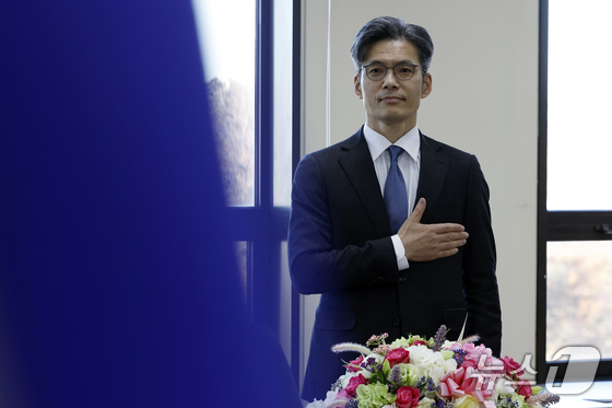 박철우 신임 서울중앙지검장이 21일 오전 서울 서초구 서울중앙지방검찰청에서 열린 제66대 서울중앙지방검찰청 검사장 취임식에서 국민의례를 하고 있다. 2025.11.21/뉴스1 © News1 박정호 기자