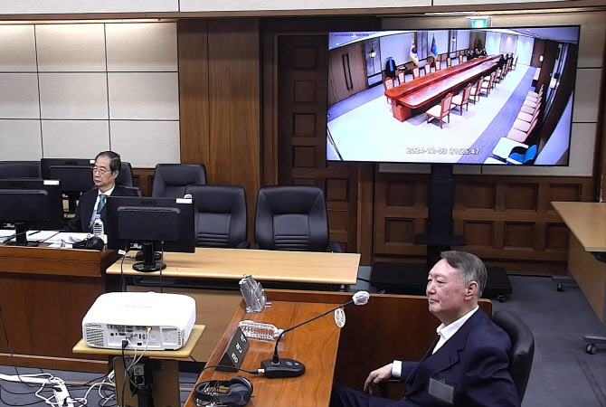 윤석열 전 대통령이 19일 서울 서초구 서울중앙지방법원에서 열린 한덕수 전 국무총리의 내란 재판에 증인으로 출석해 증거 CCTV 영상을 지켜보고 있다. 2025.11.19 [서울중앙지법 제공. 재판매 및 DB 금지]