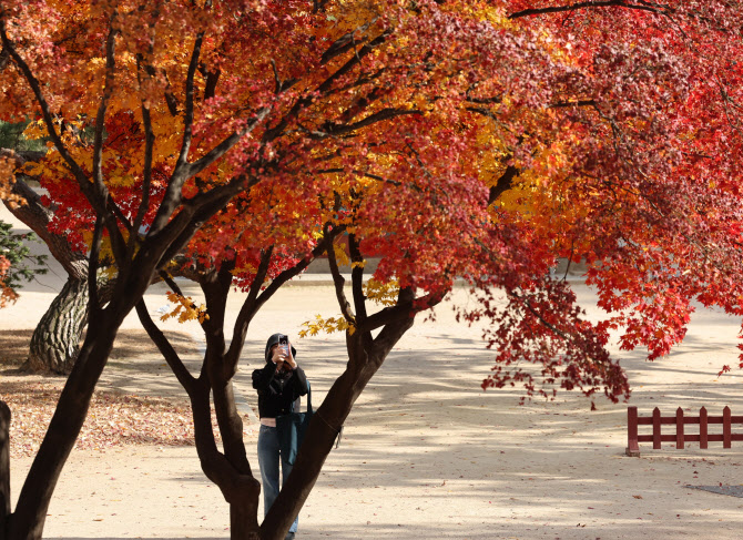 주말까지 기온이 오름세를 보이며 평년보다 온화한 날씨가 예보된 21일 오후 서울울 중구 덕수궁에서 관광객들이 붉게 물든 단풍을 구경하고 있다.(사진=뉴시스)